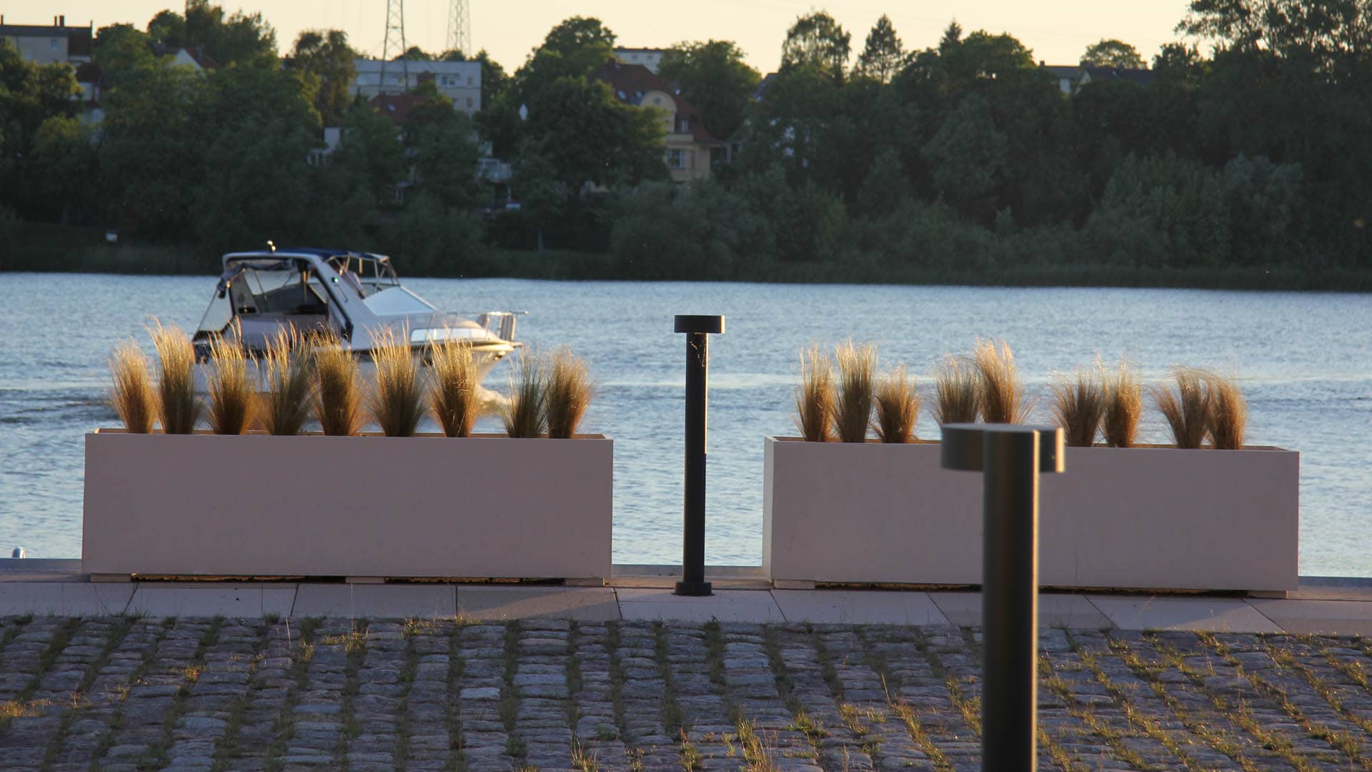 - Na drewnianym tarasie nad wodą znajdują się metalowe krzesła i stoły, dwa duże donice z ozdobną trawą oraz zacumowane w pobliżu łodzie. Bujna zieleń i drzewa w tle tworzą spokojną atmosferę nad jeziorem.