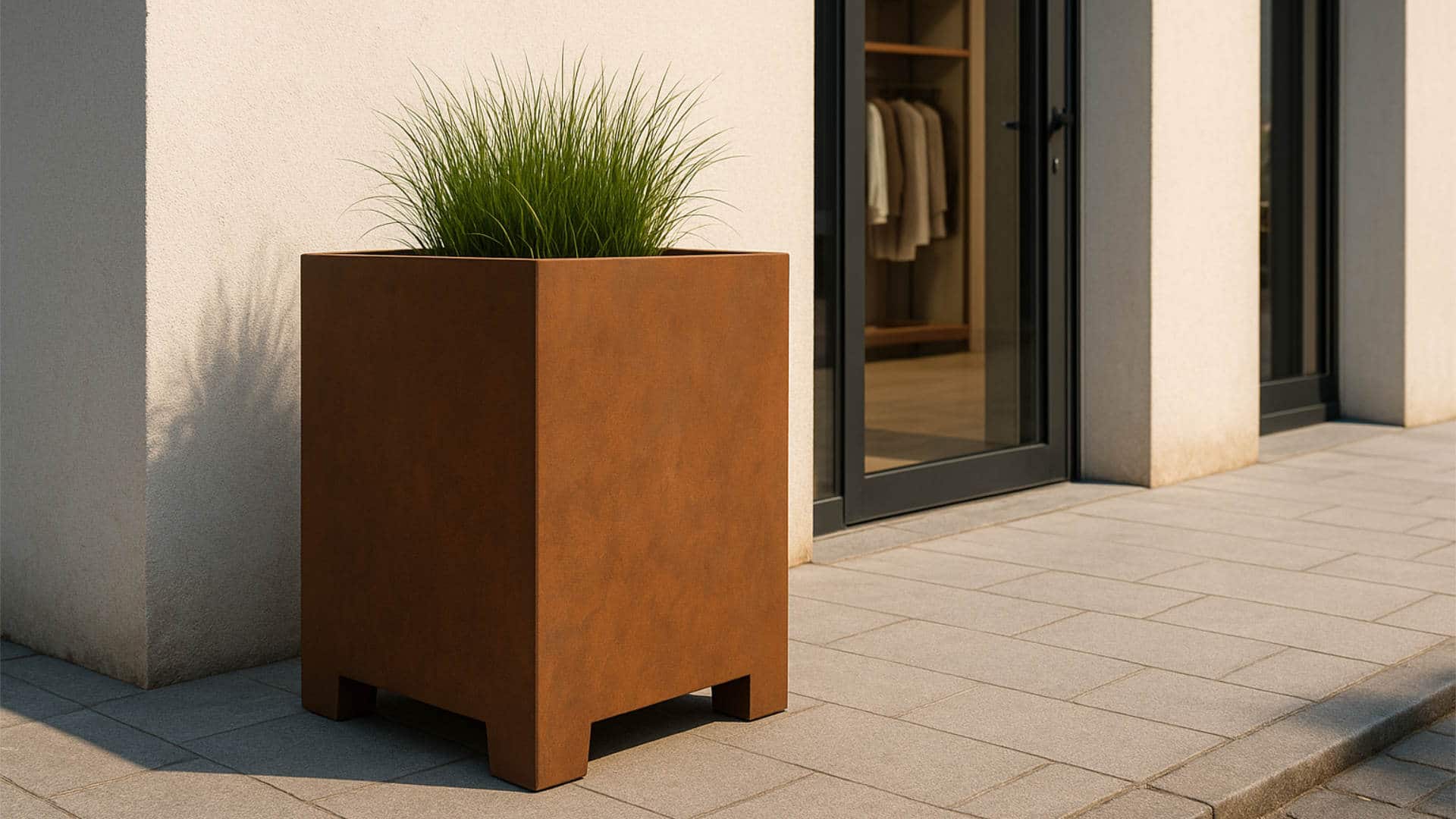 Donice ogrodowe wykonane z cortenu, jak Cecilia 2, stanowią wyrazisty element aranżacyjny, który łączy naturalną kolorystykę materiału z nowoczesną formą.